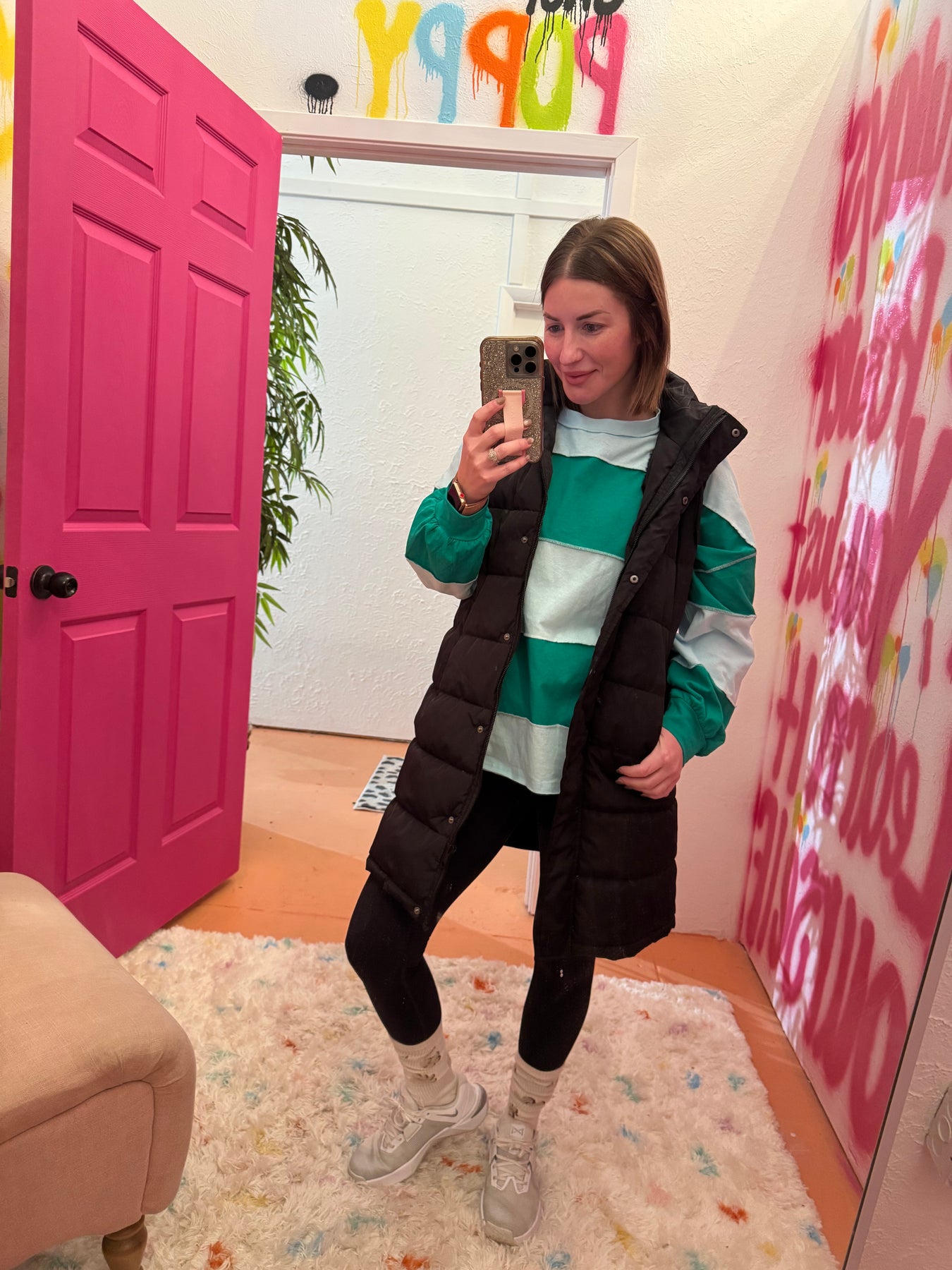 She’s got that easy, throw-on-and-go energy with bold paneling and a loose, boxy fit. Soft seams and laid-back lines make her the perfect cozy top for breezy days and chill nights.