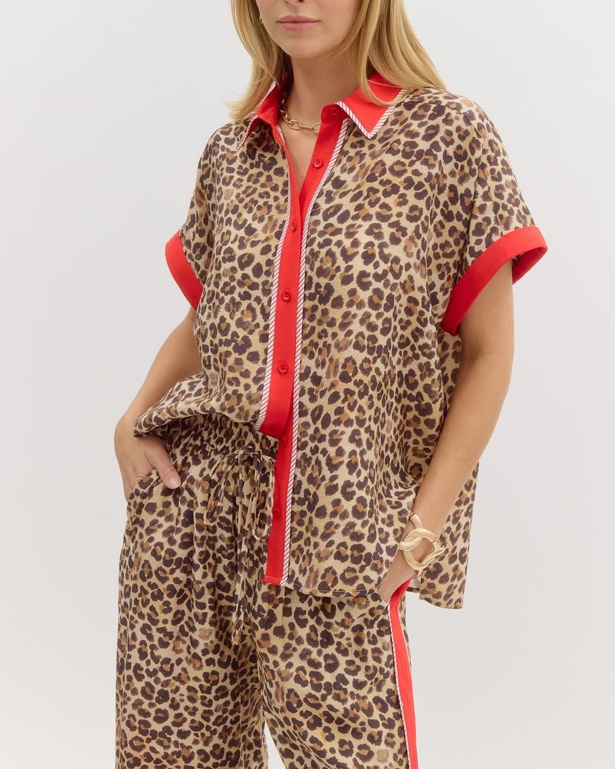 Leopard print short sleeve top. Contrasting classic collar button front closure featuring accented binding detail. Unlined. Woven. Non-sheer. Lightweight.