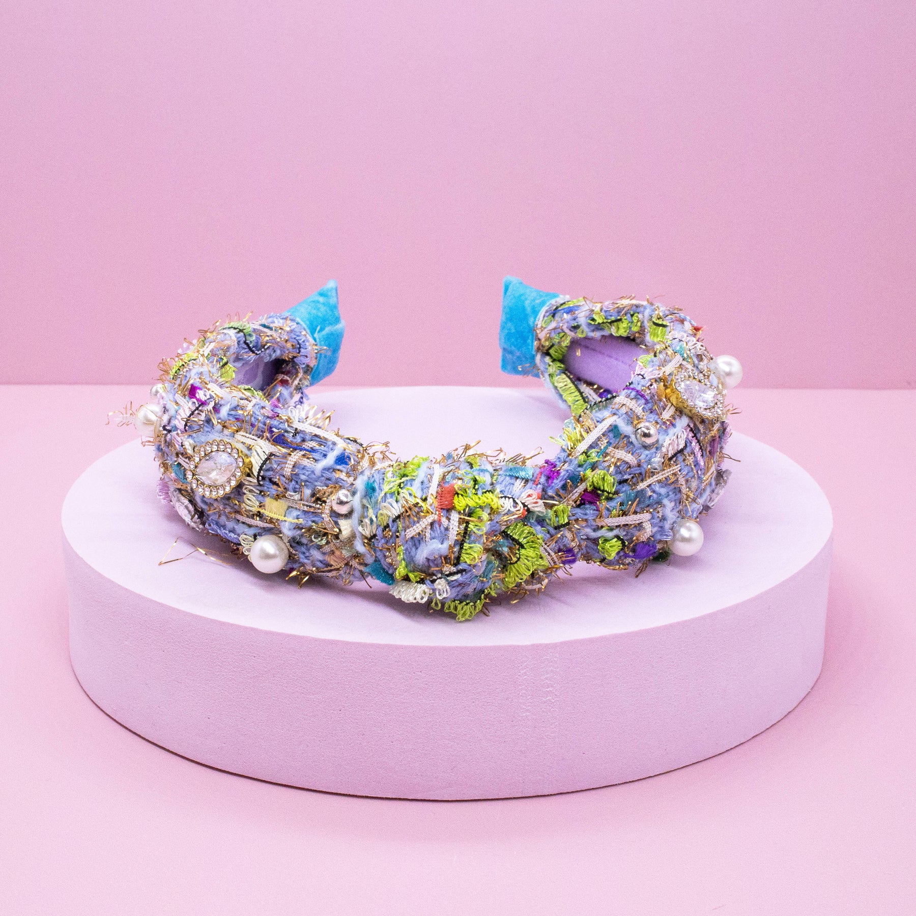Kids Knot Headband - Embellished Rhinestone Pearl Tweed: Blue