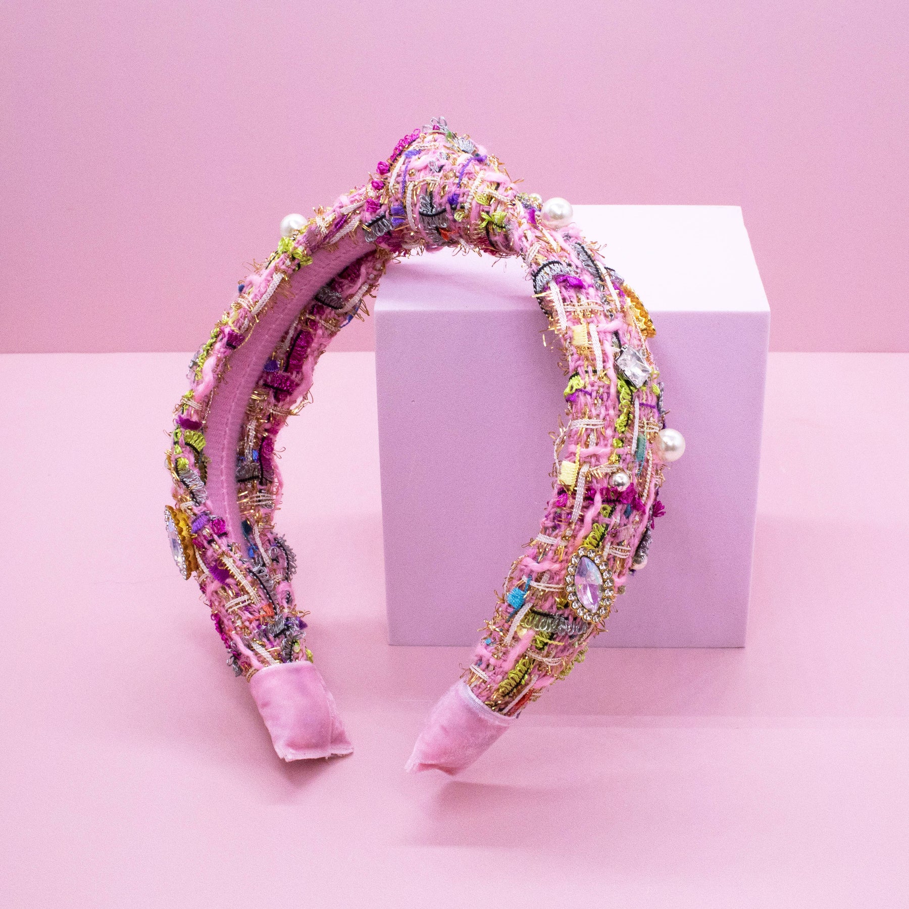 * Knot headband for girls * Colorful tweed fabric * Embellished with rhinestones and pearls * 13" size to best fit kids to tweens * Colors options - Pink or Blue The perfect knotted hairband for children's fashion boutiques, toy stores, and gift shops.