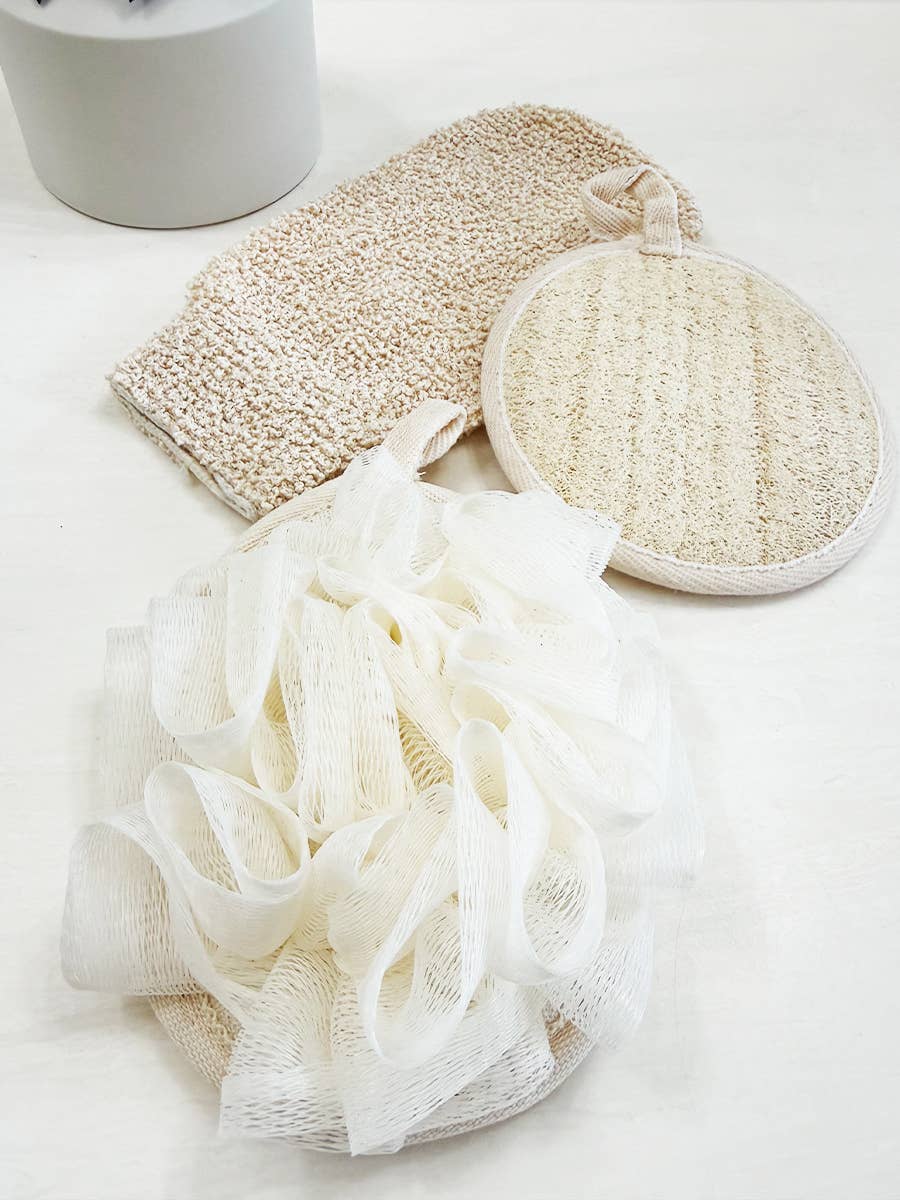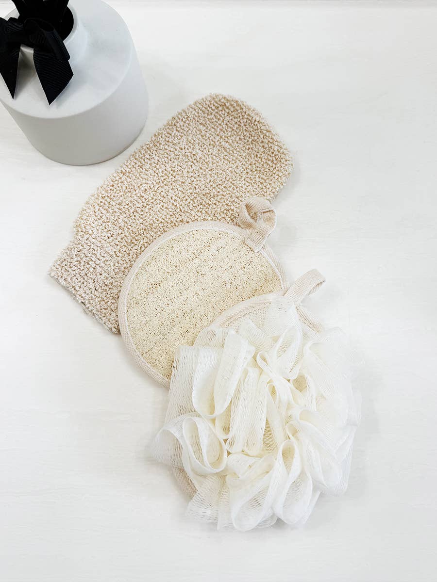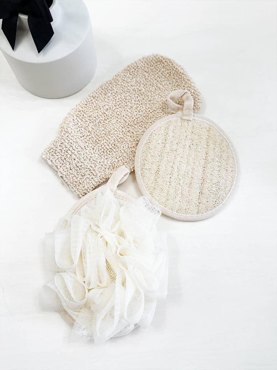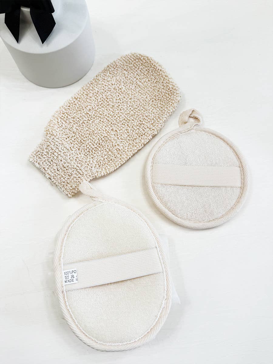 Body Exfoliation Set -Body exfoliation set helps remove dead skin cells and improves circulation and lymphatic drainage, which helps the body get rid of toxins. Your skin will look and feel its best. -3 Pcs in a Box
