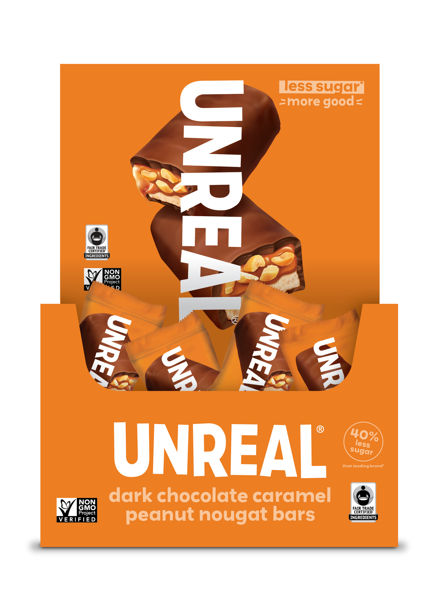 Dark Chocolate Caramel Peanut Nougat Bars * UNREAL is on a mission to build a world where you don't have to be afraid of your food, starting with your favorite indulgent snacks. * ALL-NATURAL: our caramel peanut nougat bars are non-gmo project verified and made in small batches with fair trade certified ingredients and over 70% organic ingredients. * ONLY 6G SUGAR: we keep sugar to a minimum, without using sugar alcohols, stevia, corn syrup or artificial sweeteners. We carefully formulate our caramel peanut nougat bars with only the highest quality ingredients that put flavor first without all of the sugar.