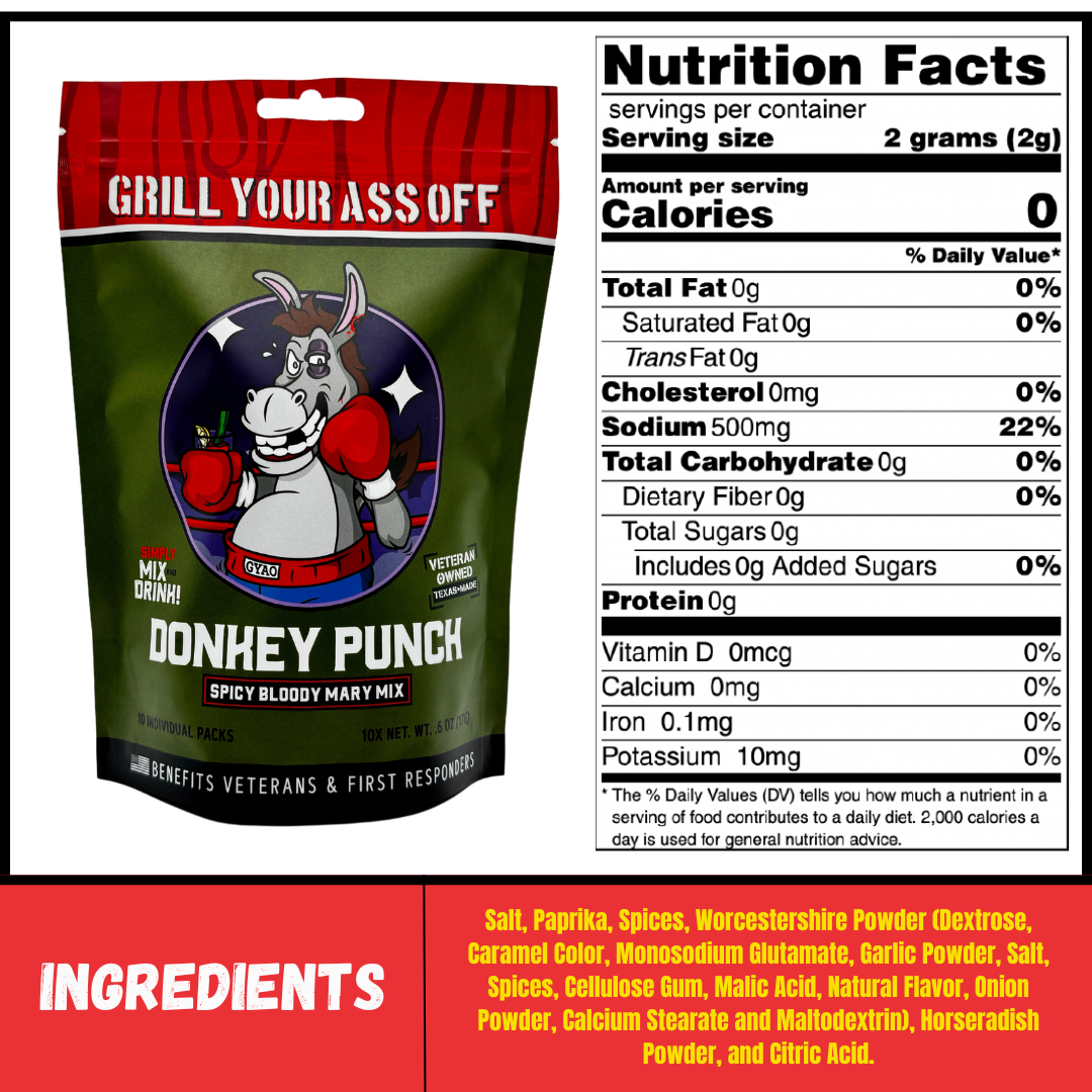 Get ready to kick your brunch into high gear with Donkey Punch Spicy Bloody Mary Mix! This perfectly portioned spice mix has a punch of bold, savory flavor that turns any Bloody Mary into a full-on flavor fiesta. Perfect for those who like their cocktails with a kick!