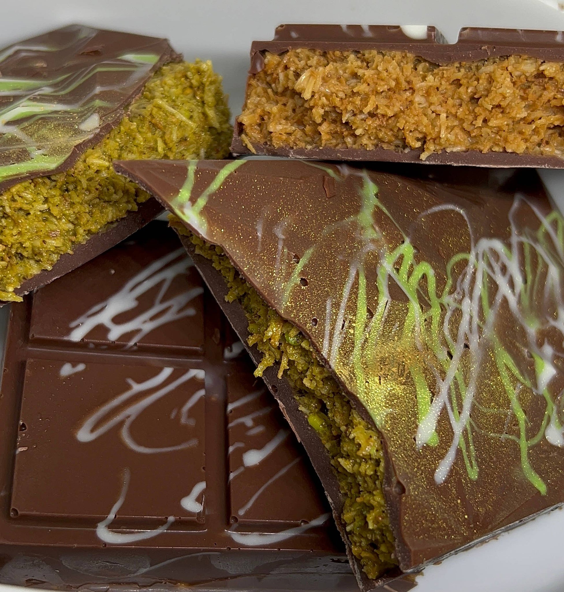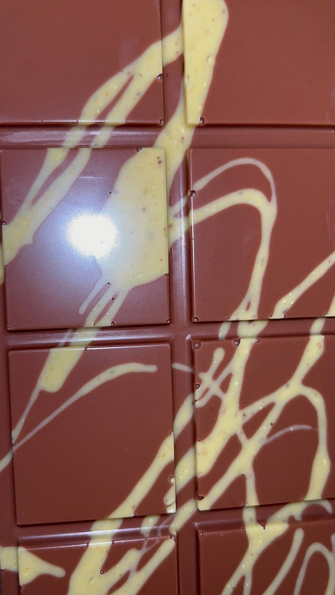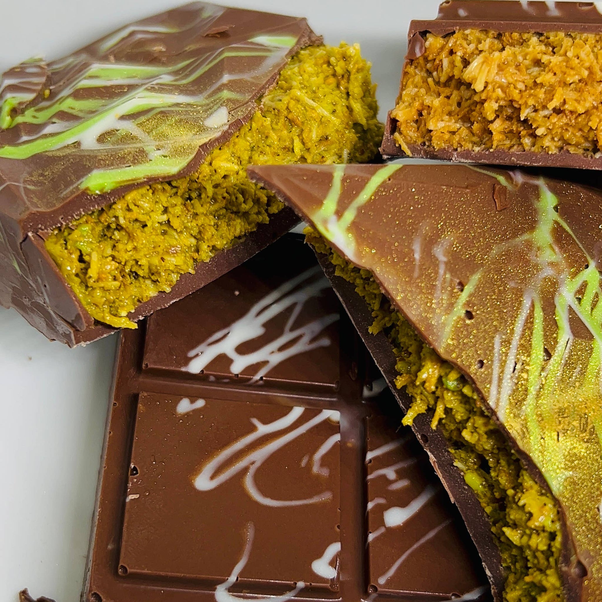 Delicious trending by pistachio chocolate bar made with our fresh pistachio butter that is made in house, This is a huge glorious 6X3 INCH bar of yummyness please keep weather in mind when ordering, we are not responsable for any melted chocolate, we always find its best when receiving chocolate to put in the refrigorator for 30 min to let rest and set, **WE DO NOT USE PISTACHIO PASTE OR BUTTER WE USE 100% PISTACHIO***