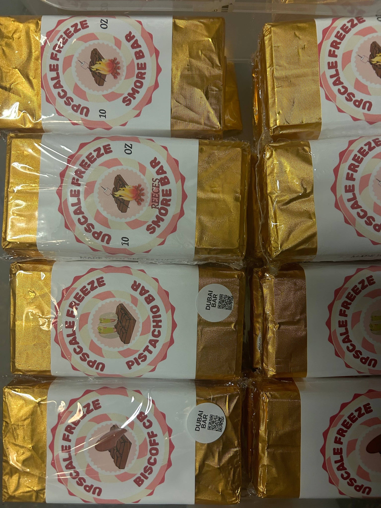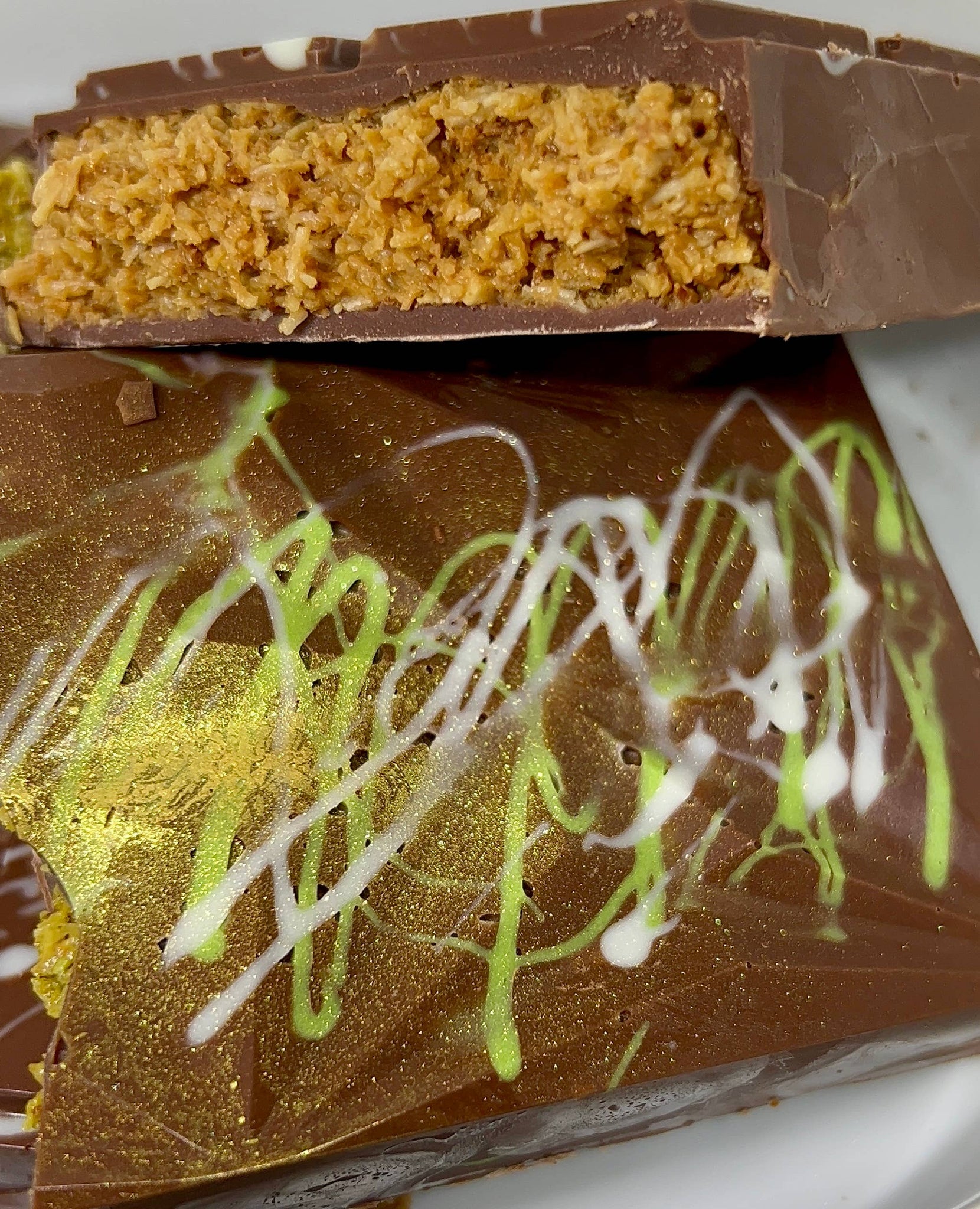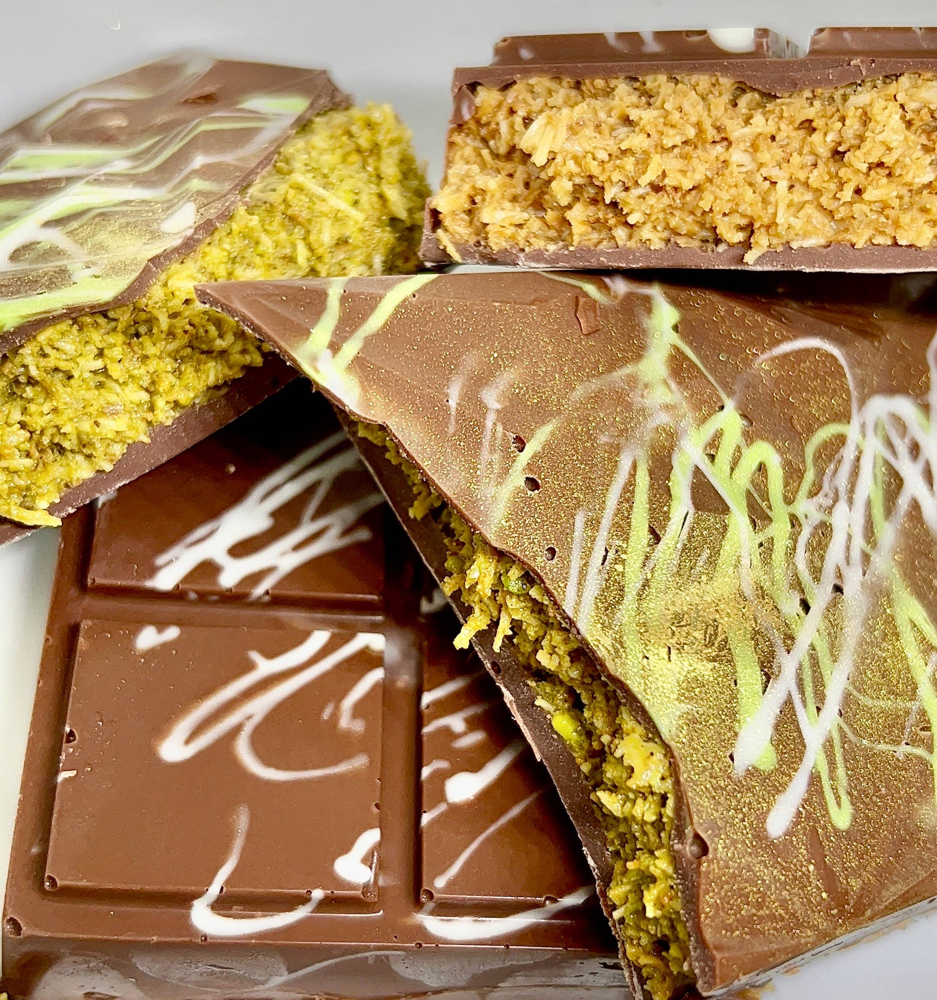 Delicious trending by pistachio chocolate bar made with our fresh pistachio butter that is made in house, This is a huge glorious 6X3 INCH bar of yummyness please keep weather in mind when ordering, we are not responsable for any melted chocolate, we always find its best when receiving chocolate to put in the refrigorator for 30 min to let rest and set, **WE DO NOT USE PISTACHIO PASTE OR BUTTER WE USE 100% PISTACHIO***