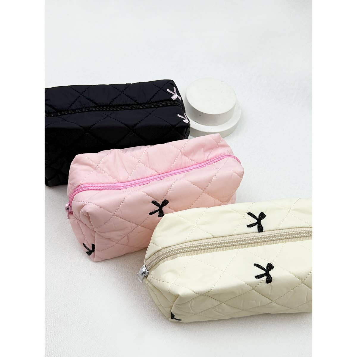 Soft Embossed Cloth with Bow Embroidery Light Weight Cosmetic Bag -Makeup Bags Portable Travel Cosmetic Bag and Organizer Multifunction Case. Portable and lightweight, easy to carry. You can bring your cosmetics to anywhere. -Individually Wrapped -Description: 7 Inch W Inch x 4.5 D x 4.5 H Inch -3 Colors