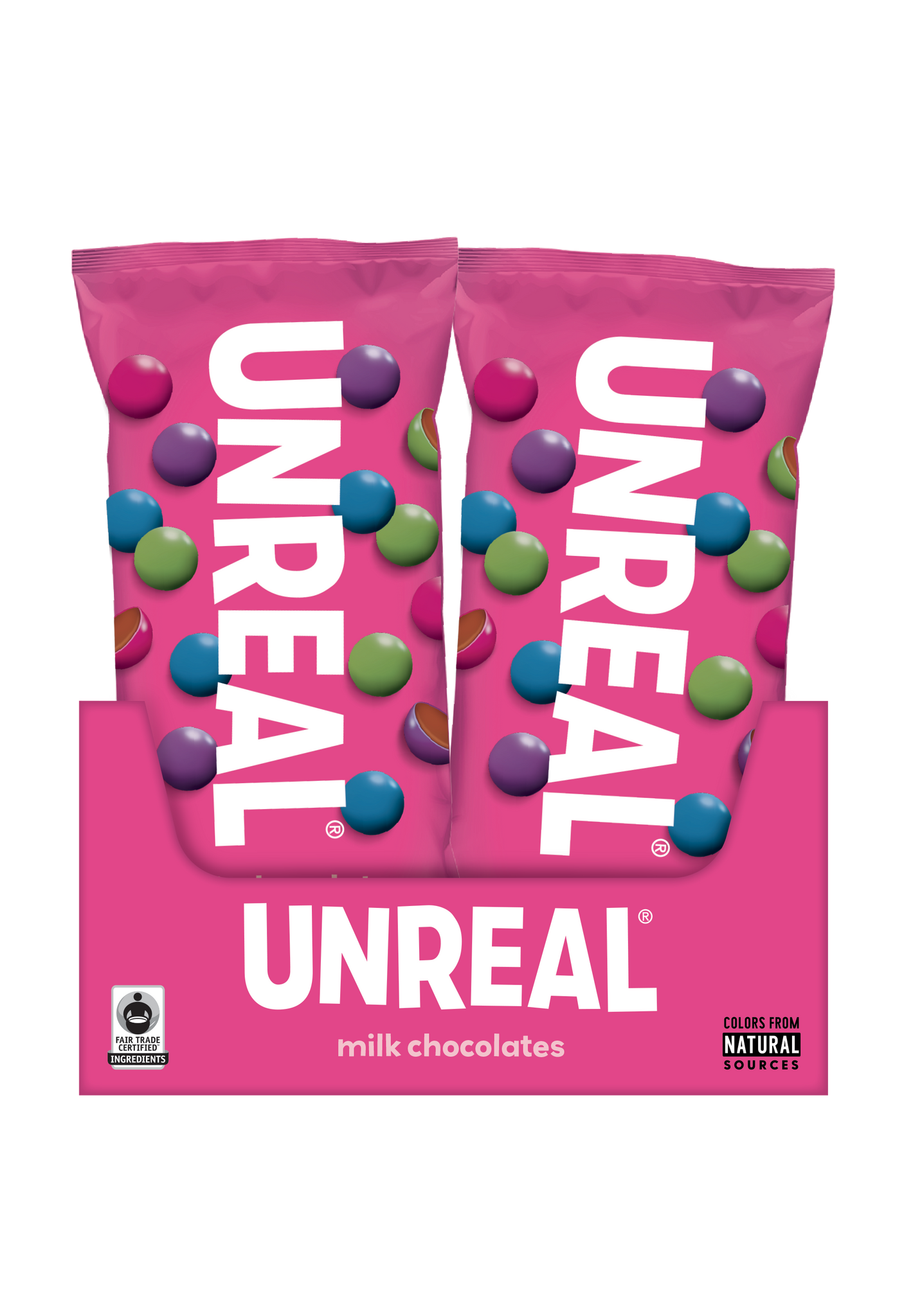 1.3 oz bags of Milk Chocolate Gems *UNREAL is on a mission to build a world where you don't have to be afraid of your food, starting with your favorite indulgent snacks. * ALL-NATURAL: our milk chocolates are made with RBST-free dairy, do not contain soy ingredients and are made in small batches with fair trade certified ingredients. * COLORED BY NATURE: we only use colors from all-natural veggies such as spirulina and beets, and we never use titanium dioxide as a processing agent, as many similar products do.