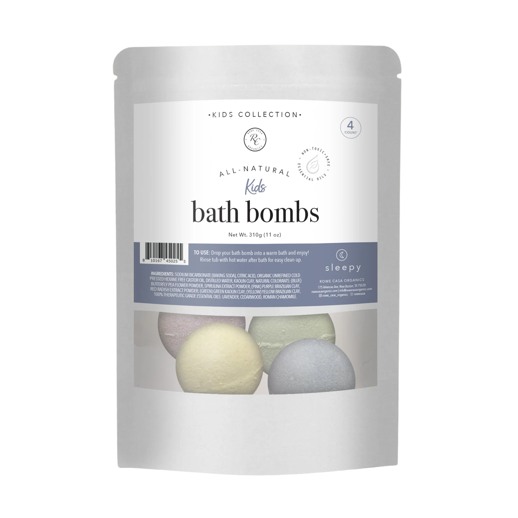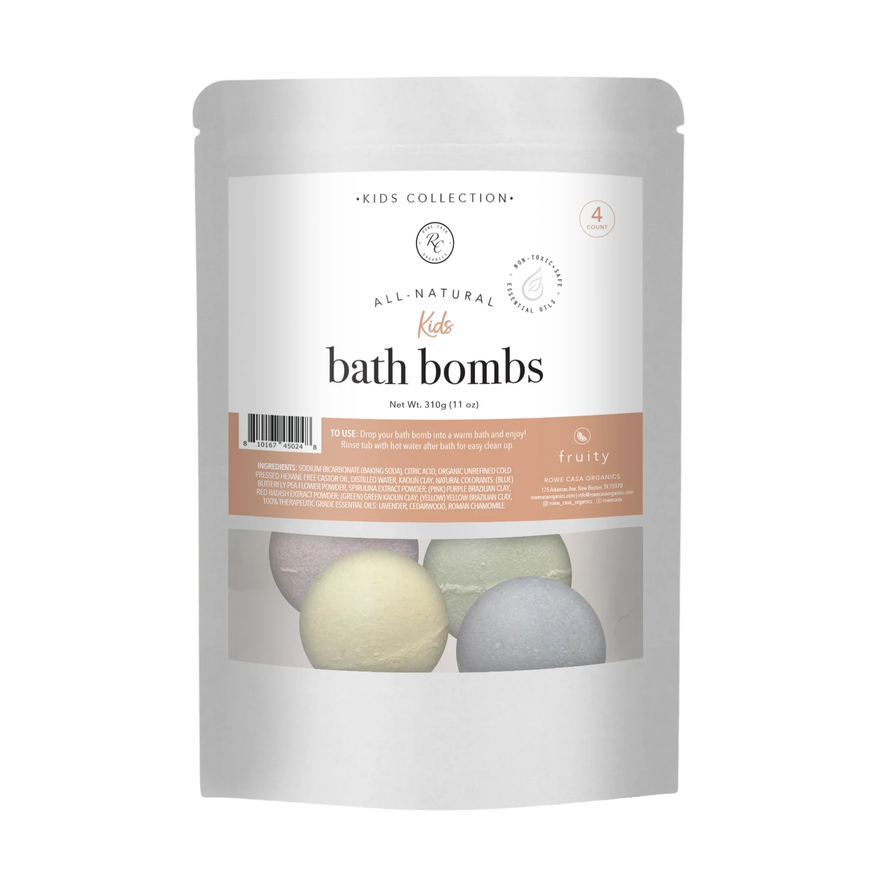 Make bath time fun and exciting for kids without any toxic chemicals! Give your child the very best with these gentle and safe, all-natural bath bombs made with plant-based colorants, and 100% pure and natural therapeutic grade essential oils. They will love watching their colored bath bomb fizz and enjoy the fruity fun scent or be calmed down with our sweet dreams scent. 4 different colors are in each bag (Blue, Pink, Green & Yellow).