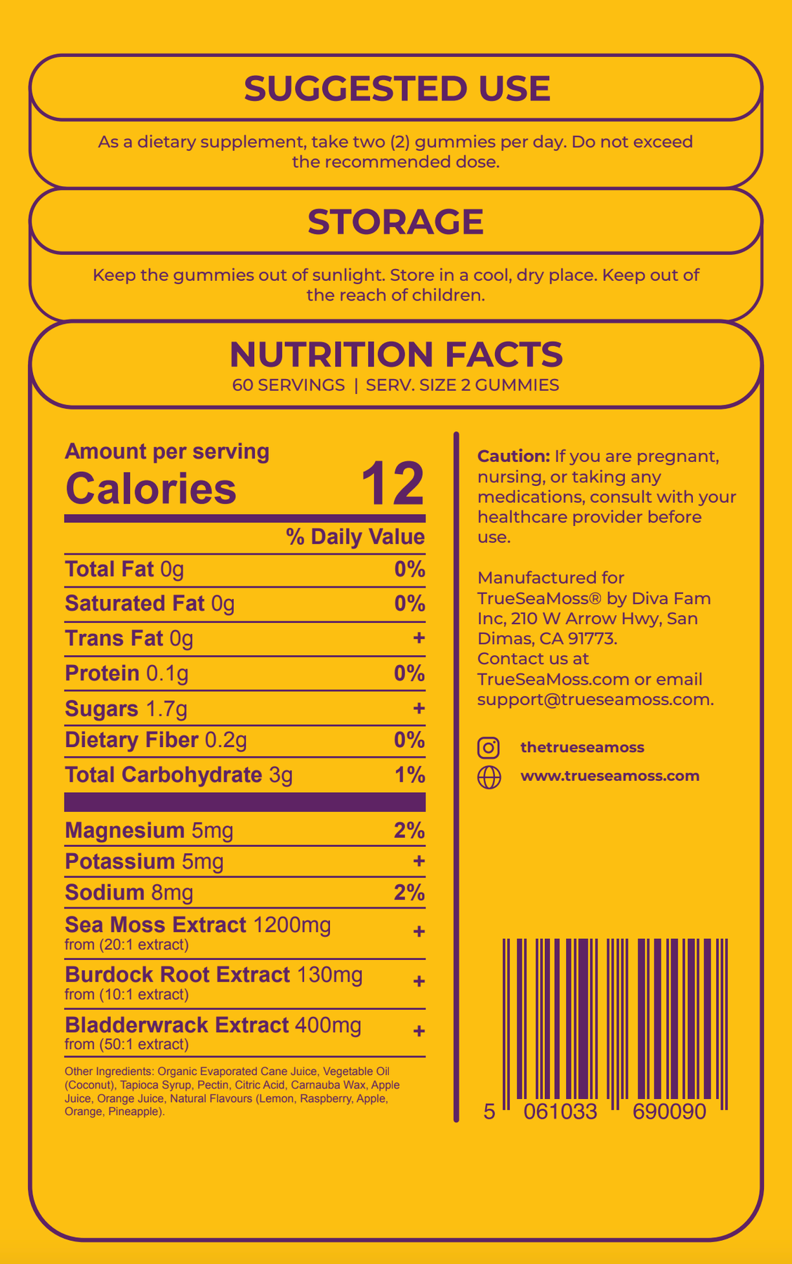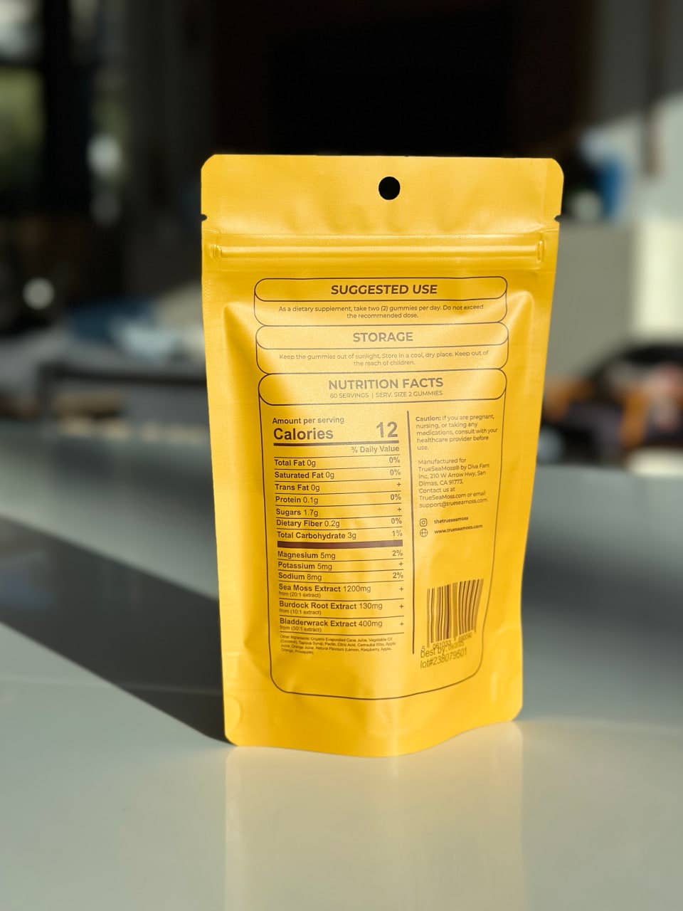 TrueSeaMoss offers nutritious, delicious, and enjoyable chewable gummies that contain 1,200 mg of Irish sea moss, a superfood rich in 92 essential minerals that are important for overall bodily function and may contribute to enhanced mood, energy, bone strength, and stress resistance. Additionally, our gummies include 130 mg of Burdock Root and 400 mg of Bladderwrack, which are natural ingredients that may support immune health, heart health, and digestion. Browse through our catalog to find your favorite flavor of gummies! Please note that the recommended maximum serving for both children and adults is two sea moss gummies per day. It's always advisable to consult with your physician before incorporating any dietary supplements, including gummies, into your regular nutrition routine.