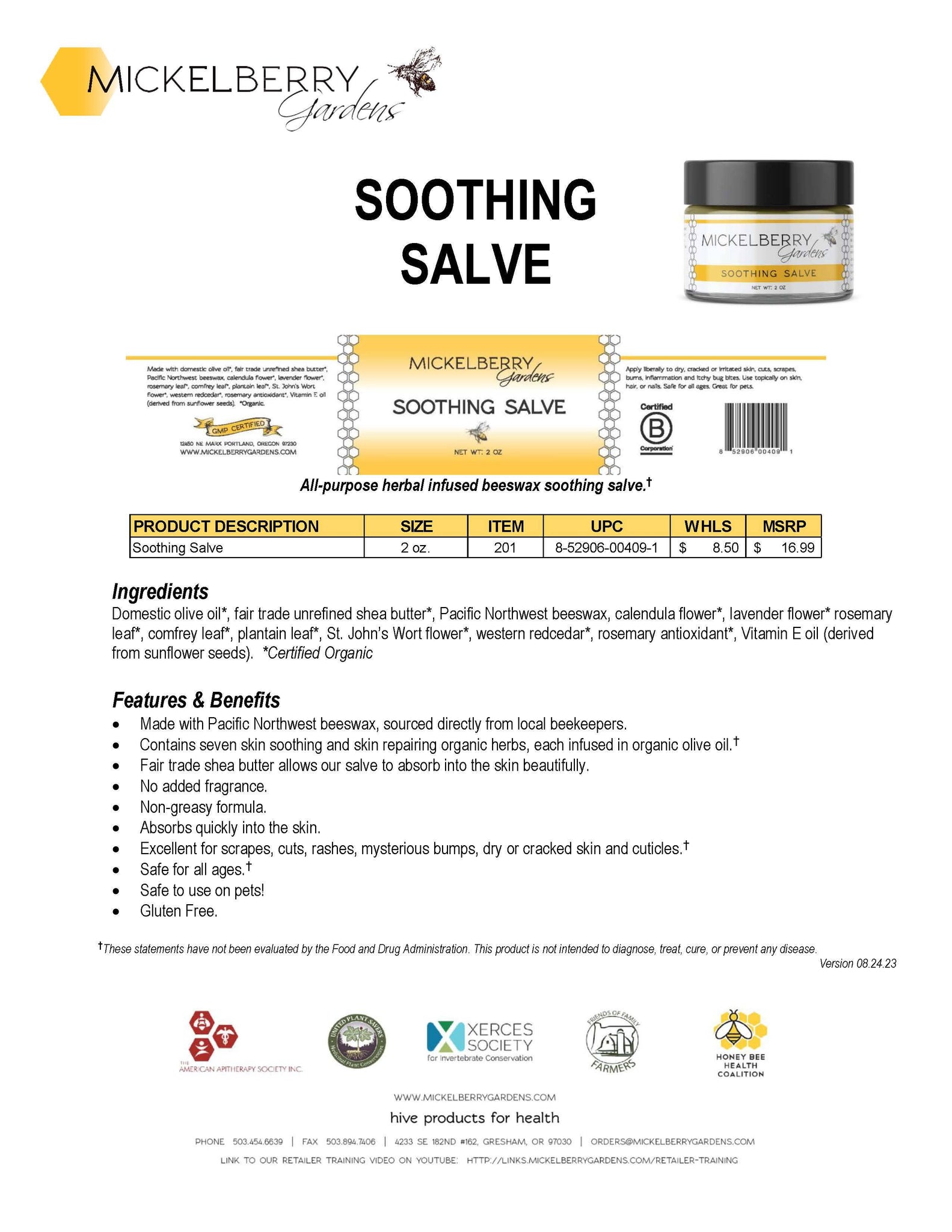 Mickelberry Gardens Soothing Salve utilizes seven soothing, organic herbs infused into olive oil to deliver their healing powers to your skin. It is made with treatment-free Pacific Northwest beeswax, along with skin nourishing domestic olive oil and fair-trade Shea butter. It contains no added fragrance and is very gentle.